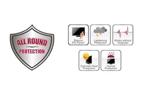 LG TVs are equipped with All round protection with a Robust IPS Panel, Lightening Protection, Summer Heat Protection, Humidity Protection & Works without Stabilizer.