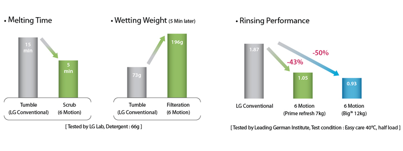 No more pre wash and less washing time. Deep washing makes no more pre wash and reduced total washing time. Less detergent usage possible because of better dissolving and rinsing performance.