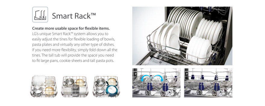 LG’s unique Smart Rack™ system allows you to easily adjust the tines for flexible loading of bowls, pasta plates and virtually any other type of dishes. If you need more flexibility, simply fold down all the tines. The tall tub will provide the space you need to fit large pans, cookie sheets and tall pasta pots.