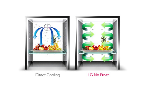 LG Total No Frost System cools down temperature faster when warm food is put into fridge compartment.