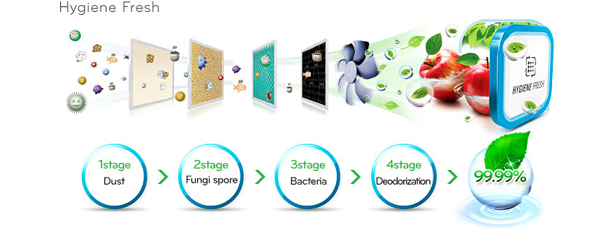Applying LG patent anti microbial material(Kimchi lactic acid), Hygiene Fresh realizes a strong sterilization and deodorization performance with 4-stage filtering system which is effective in reducing fungi spore and harmful bacteria in the rate of 99.99% and deodorizing inside the refrigerator.