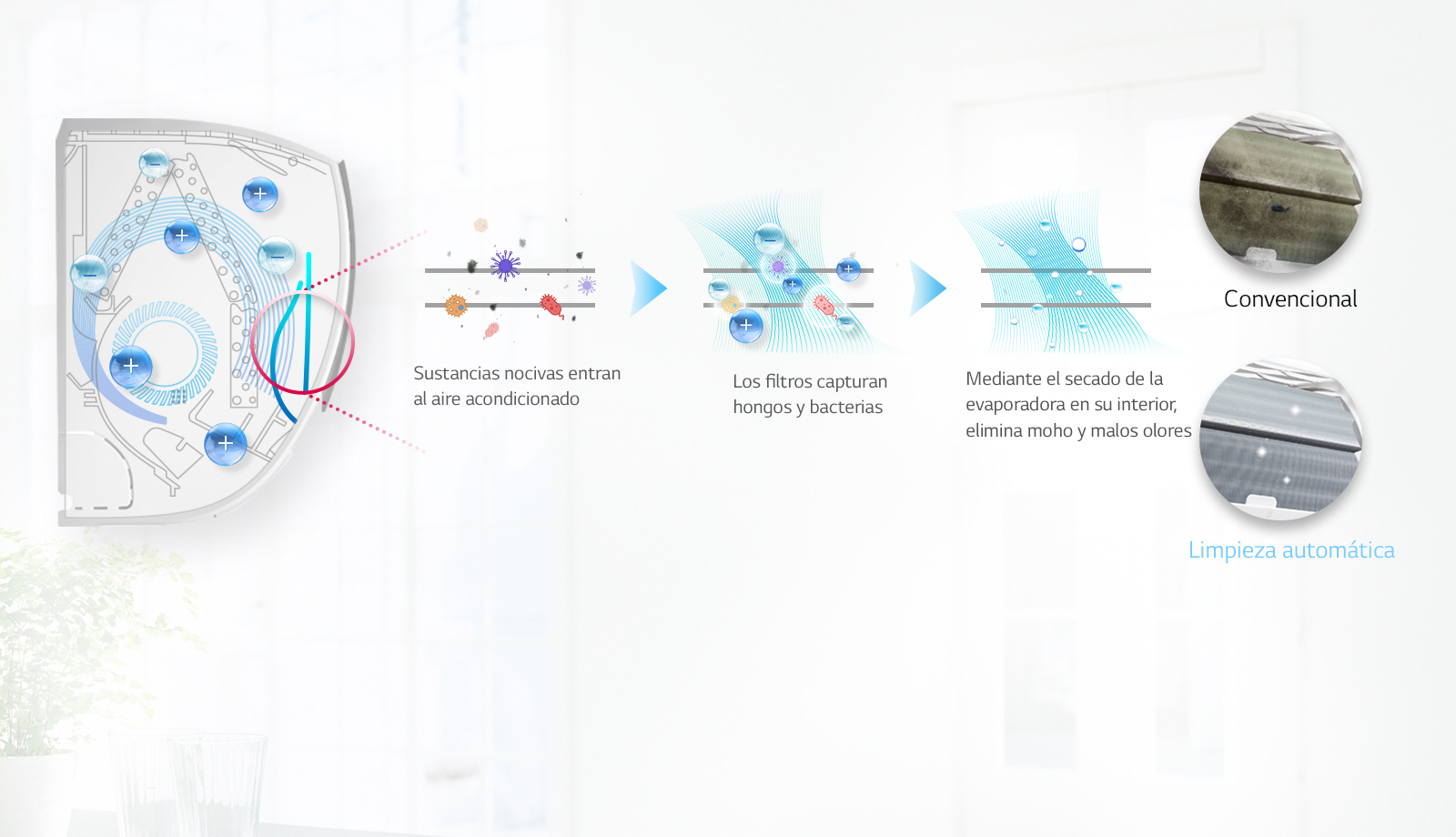 La función integral de limpieza automática evita la formación de bacterias y moho en el intercambiador de calor y proporciona un entorno más agradable y cómodo para el usuario.