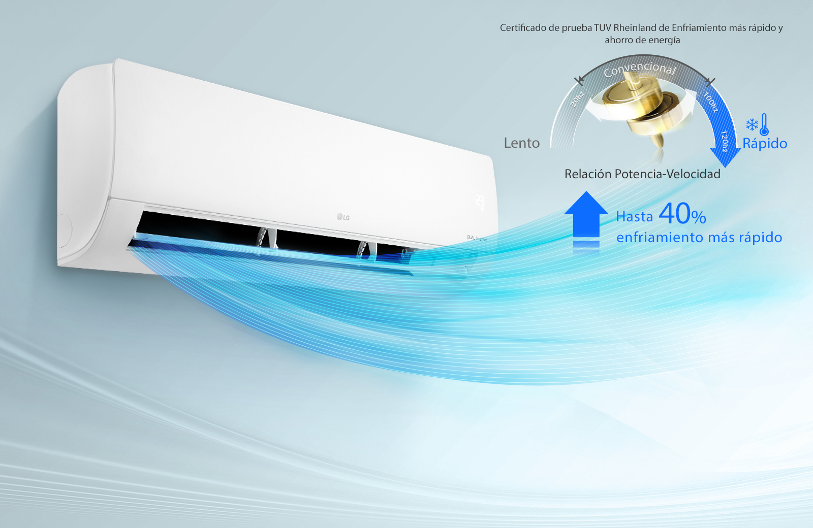 El aire acondicionado LG enfría el aire rápidamente gracias a su rango de enfriamiento de alta velocidad con Compresor Dual Inverter™, de manera que expulsa el aire y enfría espacios más rápido.