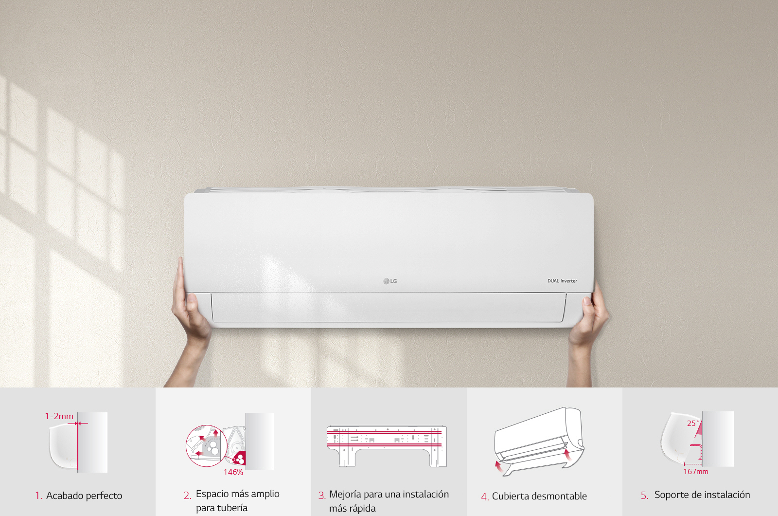 El Compresor Dual Inverter™ de LG resuelve problemas inadecuados, ineficaces y ruidosos, resultando en un aire acondicionado que enfría más rápido, dura más y opera con menos ruido. Con la garantía de 10 años del compresor, los usuarios pueden disfrutar de los beneficios del aire acondicionado de LG durante un período de tiempo mayor.